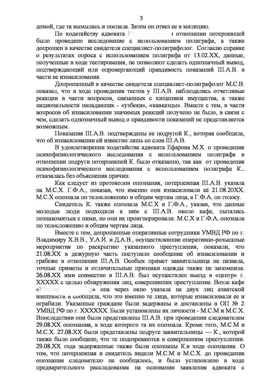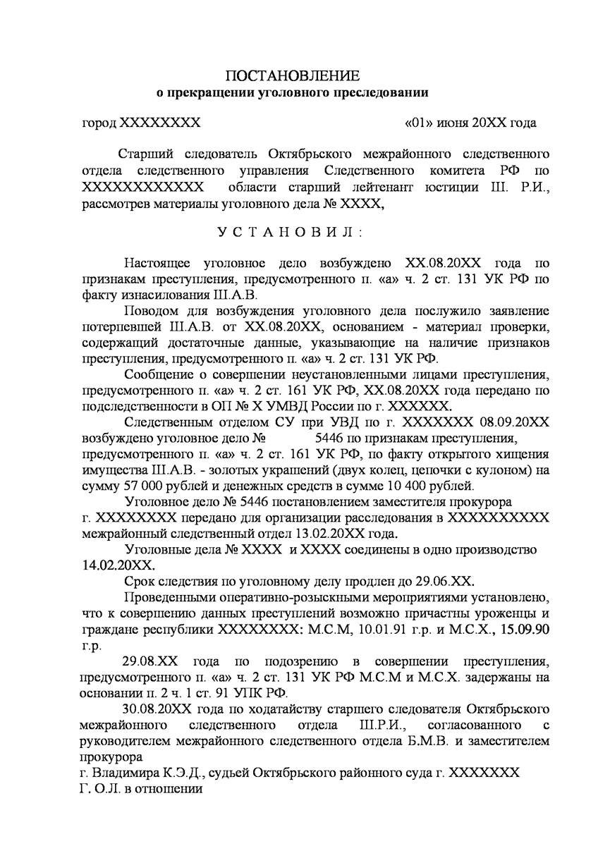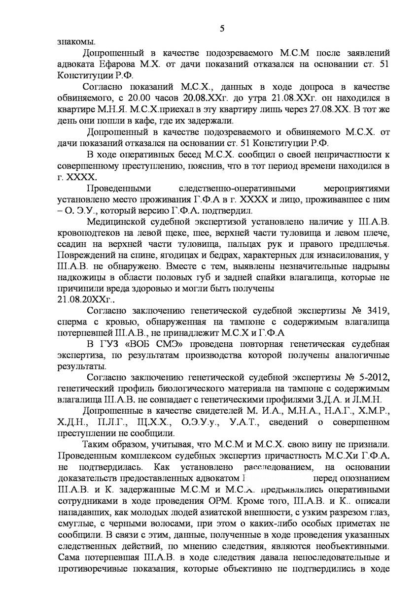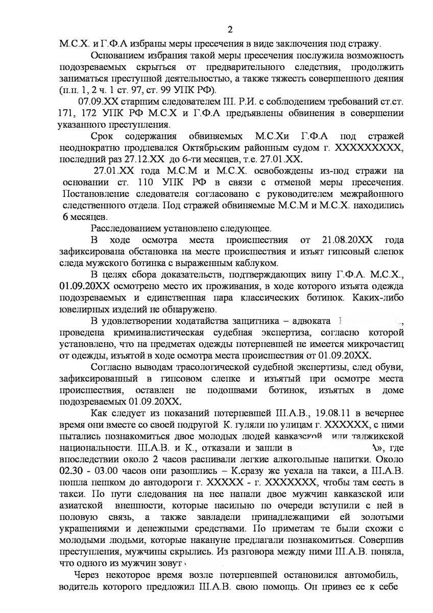 Адвокат добился прекращения уголовного дела на стадии предварительного расследования по реабилитирующим основаниям в отношении двух граждан иностранного государства обвиняемых органами предварительно следствия в совершении преступления предусмотренного п. «а» ч.2 ст.131 УК РФ (изнасилование совершенное группой лиц) и п."а" , п."г" ч.2 ст.161 УК РФ (грабёж), наказание за которое предусматривает лишение свободы от восьми до пятнадцати лет, то есть преступление, которое в соответствии с ч.5 ст.15 Уголовного Кодекса Российской Федерации отнесено к категории особо тяжких преступлений.